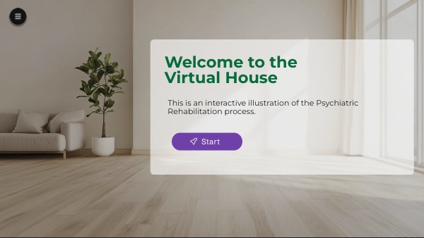 This Virtual House is an interactive illustration of the Psychiatric Rehabilitation process. Each room represents one of the four key steps—Consider, Choose, Get, and Keep—all supported by a foundation of willingness and preparation and a roof of skills and supports that contribute to success and satisfaction in a valued role. Created by the New York Psychiatric Rehabilitation Training Academy, this house is designed to help you learn, reflect, and move through each step of the process with confidence. Feel free to explore, revisit rooms, and learn at your own pace. Let's Begin!