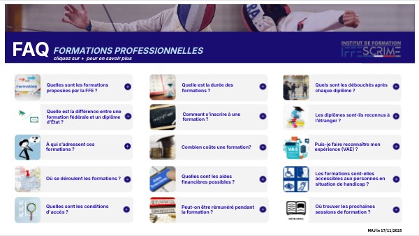 La Fédération Française d’Escrime propose trois diplômes professionnels reconnus par le Ministère des Sports :