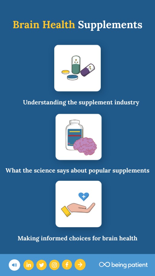 The term "supplements" refers to non-medical products like vitamins, minerals, herbs, or amino acids in the form of pills, powders, or drinks, and marketed to “support” health. “Brain health supplements” is a category that claims to help with memory, focus, mood, or protection against cognitive decline.