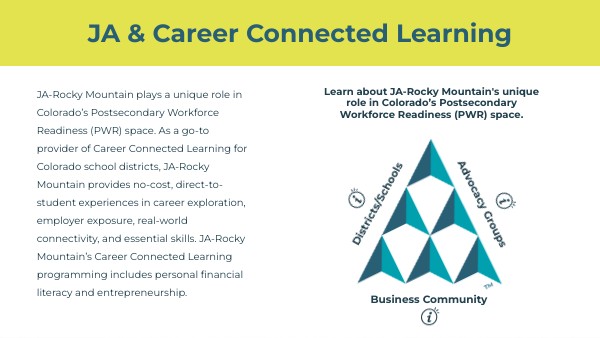 JA-Rocky Mountain plays a unique role in Colorado’s Postsecondary Workforce Readiness (PWR) space. As a go-to provider of Career Connected Learning for Colorado school districts, JA-Rocky Mountain provides no-cost, direct-to-student experiences in career exploration, employer exposure, real-world connectivity, and essential skills. JA-Rocky Mountain’s Career Connected Learning programming includes personal financial literacy and entrepreneurship.