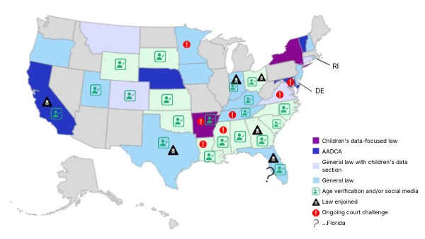 Children's data-focused law AADCA General law with children's data section General law Age verification and/or social media Law enjoined Ongoing court challenge ...Florida