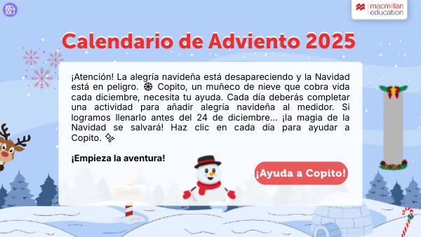 ¡Atención! La alegría navideña está desapareciendo y la Navidad está en peligro. ❄️ Copito, un muñeco de nieve que cobra vida cada diciembre, necesita tu ayuda. Cada día deberás completar una actividad para añadir alegría navideña al medidor. Si logramos llenarlo antes del 24 de diciembre… ¡la magia de la Navidad se salvará! Haz clic en cada día para ayudar a Copito. ✨ ¡Empieza la aventura!