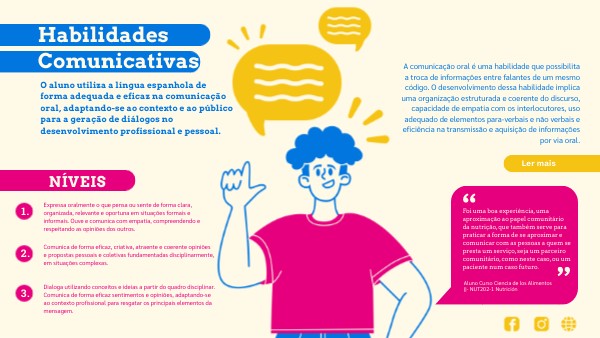 O aluno utiliza a língua espanhola de forma adequada e eficaz na comunicação oral, adaptando-se ao contexto e ao público para a geração de diálogos no desenvolvimento profissional e pessoal.