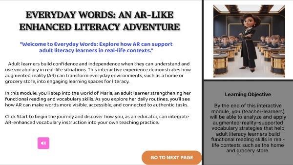 Adult learners build confidence and independence when they can understand and use vocabulary in real-life situations. This interactive experience demonstrates how augmented reality (AR) can transform everyday environments, such as a home or grocery store, into engaging learning spaces for literacy. In this module, you’ll step into the world of Maria, an adult learner strengthening her functional reading and vocabulary skills. As you explore her daily routines, you’ll see how AR can make words more visible, accessible, and connected to authentic tasks. Click Start to begin the journey and discover how you, as an educator, can integrate AR-enhanced vocabulary instruction into your own teaching practice.