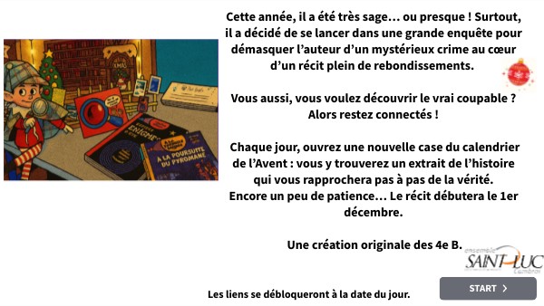 Cette année, il a été très sage… ou presque ! Surtout, il a décidé de se lancer dans une grande enquête pour démasquer l’auteur d’un mystérieux crime au cœur d’un récit plein de rebondissements. Vous aussi, vous voulez découvrir le vrai coupable ? Alors restez connectés ! Chaque jour, ouvrez une nouvelle case du calendrier de l’Avent : vous y trouverez un extrait de l’histoire qui vous rapprochera pas à pas de la vérité. Encore un peu de patience… Le récit débutera le 1er décembre. Une création originale des 4e B.