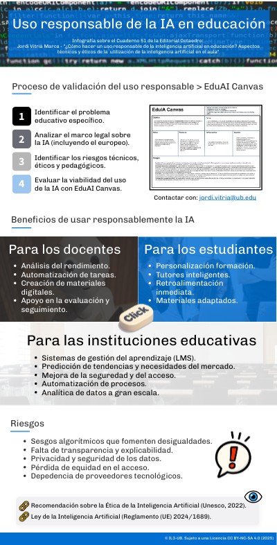 Infografía sobre el Cuaderno 51 de la Editorial Octaedro: Jordi Vitrià Marca - "¿Cómo hacer un uso responsable de la inteligencia artificial en educación? Aspectos técnicos y éticos de la utilización de la inteligencia artificial en el aula"