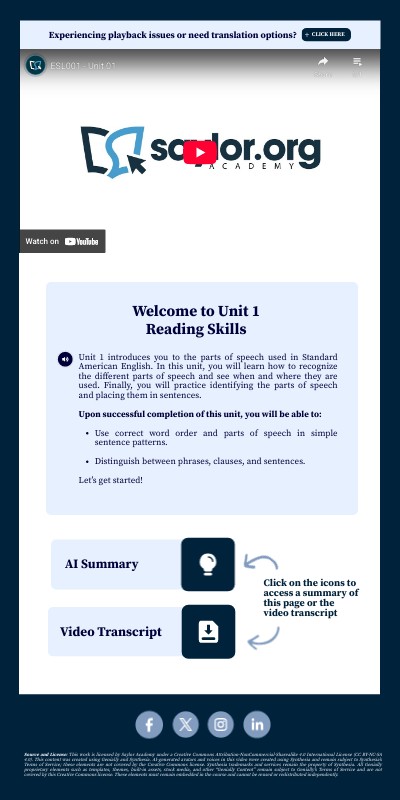 Unit 1: Reading Skills focuses on understanding and applying the essential parts of speech in Standard American English. It emphasizes sentence construction and differentiating between phrases, clauses, and sentences. Here are some key takeaways: