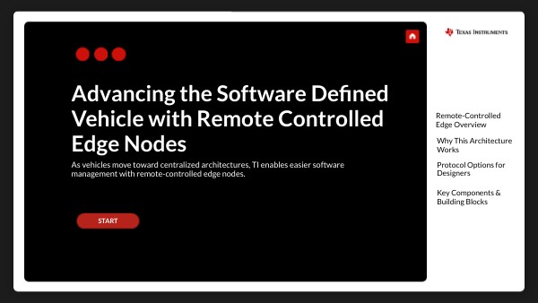 As automotive markets embrace SDVs and ECU consolidation through zone architectures, the push to centralize software continues to increase in order to allow for enhanced scalability and wire reduction. This shift requires automakers to fundamentally rethink vehicle architectures. TI’s remote-controlled edge node technology addresses this need with three critical advantages for next-generation vehicles: