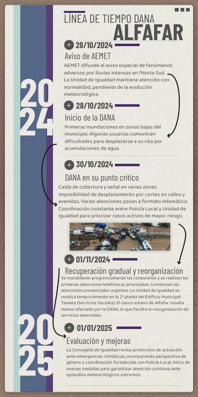 Se restablecen progresivamente las conexiones y se realizan las primeras atenciones telefónicas priorizadas. Comienzan las atenciones presenciales urgentes. La Unidad de Igualdad se reubica temporalmente en la 2ª planta del Edificio Municipal Tauleta (Servicios Sociales). El casco urbano de Alfafar resulta menos afectado por la DANA, lo que facilita la reorganización de servicios esenciales.