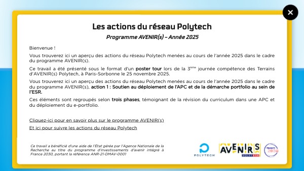 Bienvenue ! Vous trouverez ici un aperçu des actions du réseau Polytech menées au cours de l'année 2025 dans le cadre du programme AVENIR(s). Ce travail a été présenté sous le format d'un poster tour lors de la 3ème journée compétence des Terrains d'AVENIR(s) Polytech, à Paris-Sorbonne le 25 novembre 2025. Vous trouverez ici un aperçu des actions du réseau Polytech menées au cours de l'année 2025 dans le cadre du programme AVENIR(s), action 1 : Soutien au déploiement de l’APC et de la démarche portfolio au sein de l’ESR. Ces éléments sont regroupés selon trois phases, témoignant de la révision du curriculum dans une APC et du déploiement du e-portfolio. Cliquez-ici pour en savoir plus sur le programme AVENIR(s) Et ici pour suivre les actions du réseau Polytech