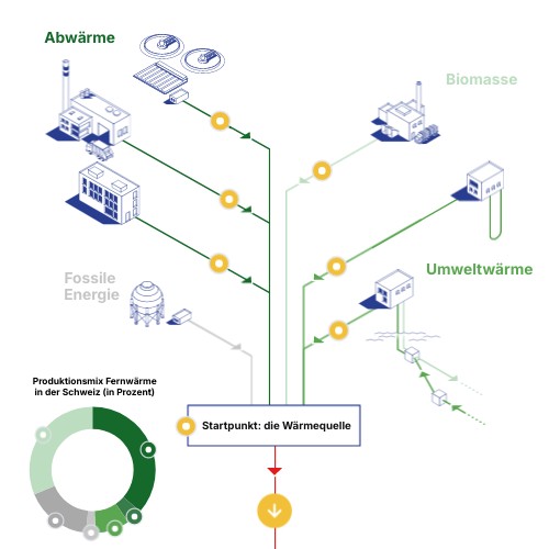Ob aus Seewasser, Holz oder Abwärme: Fernwärmeverbunde nutzen lokal verfügbare, erneuerbare Energiequellen und versorgen ganze Quartiere zuverlässig mit Wärme. Unsere Infografik zeigt, wie und wo Wärme durch Leitungen fliesst.