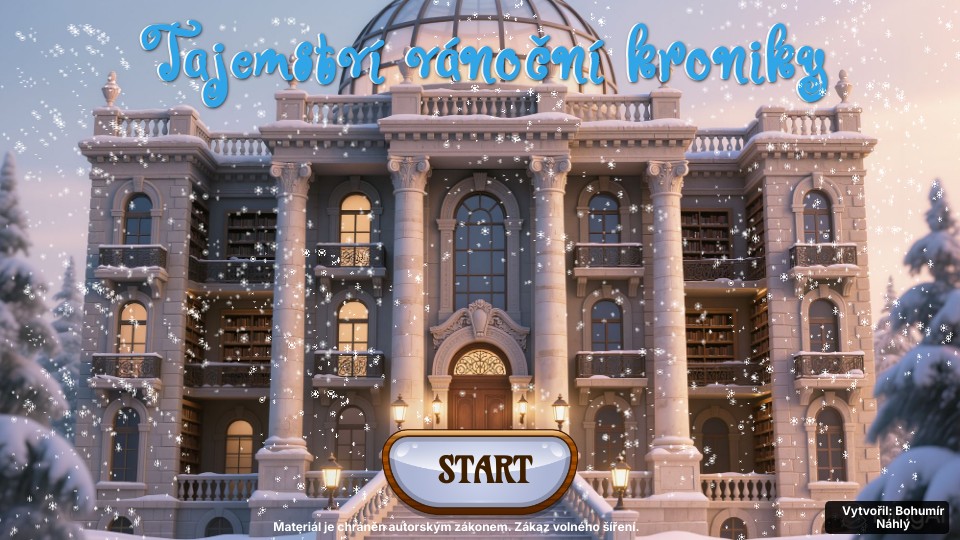 Vánoční kronika – prastará kniha, která uchovává celou historii Vánoc a tradice – byla vždy bezpečně uložena v hlavním sále knihovny. Ale letos se stalo něco nečekaného. Kronika se ocitla v tajemné místnosti, která se nachází v nejhlubším patře knihovny hluboko pod zemí. Nikdo neví, jak se tam dostala – říká se, že za to mohou nějaká kouzla.Tato místnost je chráněna čtyřmi zámky, které lze odemknout pouze pomocí speciálních klíčů. Klíče jsou ukryty v různých částech knihovny, každý střežen jazykovým úkolem. Profesor starající se o kroniku je bezradný, potřebuje tvou pomoc.