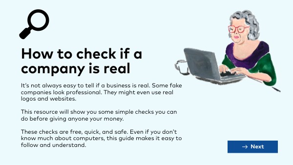 It’s not always easy to tell if a business is real. Some fake companies look professional. They might even use real logos and websites. This resource will show you some simple checks you can do before giving anyone your money. These checks are free, quick, and safe. Even if you don’t know much about computers, this guide makes it easy to follow and understand.