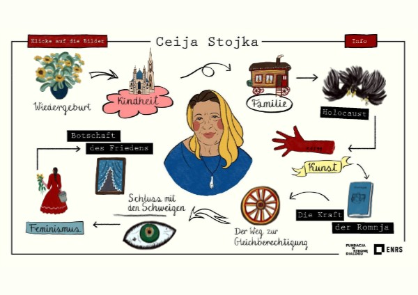 Ceija Stojka (1933–2013) war eine Roma-Aktivistin, Künstlerin, Malerin, Schriftstellerin und Dichterin. Die interaktive Arbeitskarte wurde als didaktisches Hilfsmittel für den Schulunterricht entwickelt. Anhand von zehn ausgewählten Informationen über das Leben und Werk von Ceija Stojka können Lehrkräfte die Geschichte der Roma im 20. Jahrhundert vermitteln – von den Erfahrungen des Holocaust bis zum Kampf um Erinnerung und Anerkennung in der Nachkriegszeit. Texte: Dr. Joanna Talewicz, Dr. Małgorzata KołaczekGrafikdesign: Adriana OmylakKoordination Urszula BijośUnterstützung: Cecylia Jakubczak