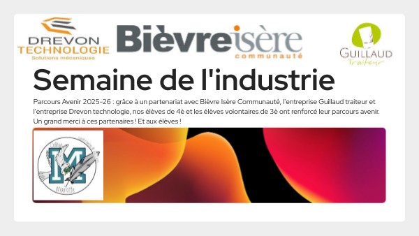 Parcours Avenir 2025-26 : grâce à un partenariat avec Bièvre Isère Communauté, l'entreprise Guillaud traiteur et l'entreprise Drevon technologie, nos élèves de 4è et les élèves volontaires de 3è ont renforcé leur parcours avenir. Un grand merci à ces partenaires ! Et aux élèves !
