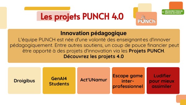 L'équipe PUNCH est née d'une volonté des enseignant·es d'innover pédagogiquement. Entre autres soutiens, un coup de pouce financier peut être apporté à des projets d'innovation via les Projets PUNCH. Découvrez les projets 4.0