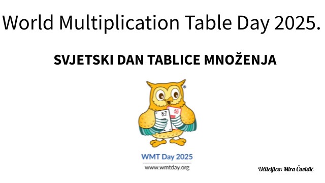 21. studenog učenici 3. razreda naše škole obilježili su Svjetski dan tablice množenja, tada je provedeno i malo natjecanje u poznavanju tablice množenja. Ovaj projekt natjecanja u znanju tablice množenja pokrenuo je Poljak Andrzej Grabowski, a cilj je projekta popularizirati učenje matematike te učenike potaknuti da se prisjete osnovnih pravila i svojstava množenja na zabavan i pomalo neobičan način, ali i približavanje množenja najmlađima na njima prihvatljiv način.