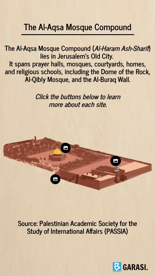 The Al-Aqsa Mosque Compound (Al-Haram Ash-Sharif) lies in Jerusalem’s Old City. It spans prayer halls, mosques, courtyards, homes, and religious schools, including the Dome of the Rock, Al-Qibly Mosque, and the Al-Buraq Wall.