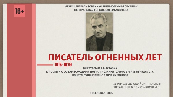 28 ноября 2025 года исполнилось 110 лет со дня рождения Константина Михайловича Симонова — прозаика, поэта, драматурга, киносценариста, журналиста и общественного деятеля. Трудно вспомнить литературный жанр, в котором писатель не пробовал бы успешно свои силы. Его перу принадлежат лирические стихи и исторические поэмы, очерки и рассказы, повести и романы, пьесы и сценарии. Постоянно выступал он как публицист и литературный критик. Много занимался документалистикой в литературе, в кино, на телевидении. Его всегда увлекало новое: начал он свой литературный путь как поэт, затем поэзия была сильно потеснена драматургией и журналистикой; в последний период жизни подлинным своим детищем считал прозу. К юбилею писателя Центральная городская библиотека подготовила виртуальную выставку «Писатель огненных лет», которая представляет собой уникальную возможность погрузиться в мир творчества Симонова, ознакомиться с его произведениями и оценить вклад писателя в русскую литературу.