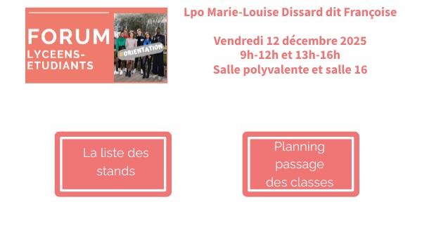 Lpo Marie-Louise Dissard dit Françoise Vendredi 12 décembre 2025 9h-12h et 13h-16h Salle polyvalente et salle 16
