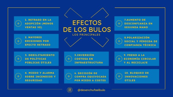 Qué provoca: bulos sobre costes ocultos o “las baterías hay que cambiarlas cada X años” disuaden a consumidores que podrían ahorrar en combustible y mantenimiento.Contraste: datos de coste total de propiedad y mejoras en fiabilidad muestran que muchos VE ya resultan competitivos; además, las garantías de batería y experiencias prácticas mejoran la fiabilidad. (también hay retos de calidad en modelos nuevos, documentados por encuestas).
