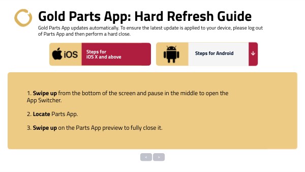 Gold Parts App updates automatically. To ensure the latest update is applied to your device, please log out of Parts App and then perform a hard close.