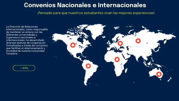 La Dirección de Relaciones Internacionales, como responsable de mantener un enlace con las diferentes universidades y organismos nacionales e internacionales, ha desarrollado diversas alianzas de cooperación formalizadas a través de convenios que facilitan el relacionamiento y movilidad de nuestra comunidad Tomasina.