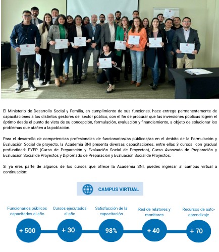 El Ministerio de Desarrollo Social y Familia, en cumplimiento de sus funciones, hace entrega permanentemente de capacitaciones a los distintos gestores del sector público, con el fin de procurar que las inversiones públicas logren el óptimo desde el punto de vista de su concepción, formulación, evaluación y financiamiento, a objeto de solucionar los problemas que atañen a la población.Para el desarrollo de competencias profesionales de funcionarios/as públicos/as en el ámbito de la Formulación y Evaluación Social de proyecto, la Academia SNI presenta diversas capacitaciones, entre ellas 3 cursos con gradual profundidad: PYEP (Curso de Preparación y Evaluación Social de Proyectos), Curso Avanzado de Preparación y Evaluación Social de Proyectos y Diplomado de Preparación y Evaluación Social de Proyectos. Si ya eres parte de algunos de los cursos que ofrece la Academia SNI, puedes ingresar al campus virtual a continuación: