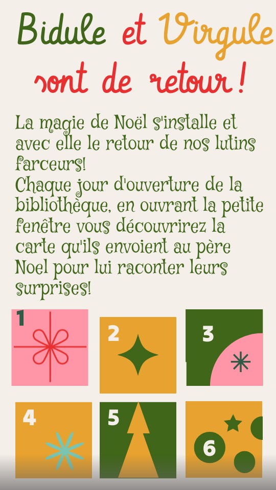 La magie de Noël s'installe et avec elle le retour de nos lutins farceurs! Chaque jour d'ouverture de la bibliothèque, en ouvrant la petite fenêtre vous découvrirez la carte qu'ils envoient au père Noel pour lui raconter leurs surprises!