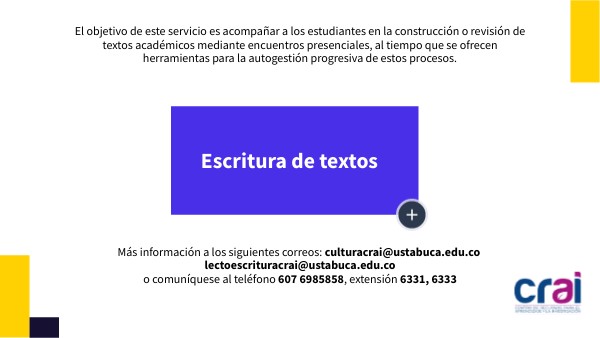 Más información a los siguientes correos: culturacrai@ustabuca.edu.co lectoescrituracrai@ustabuca.edu.co o comuníquese al teléfono 607 6985858, extensión 6331, 6333