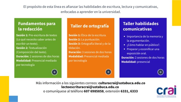 Duración: 2 sesiones de dos horas Modalidad: presencialMás información a los siguientes correos: culturacrai@ustabuca.edu.co lectoescrituracrai@ustabuca.edu.co o comuníquese al teléfono 607 6985858, extensión 6331, 6333