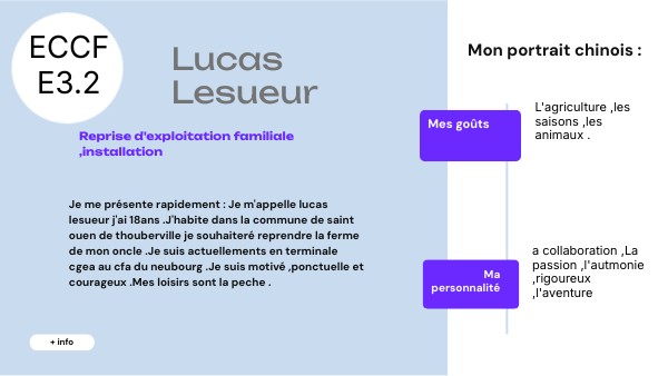 Je me présente rapidement : Je m'appelle lucas lesueur j'ai 18ans .J'habite dans la commune de saint ouen de thouberville je souhaiteré reprendre la ferme de mon oncle .Je suis actuellements en terminale cgea au cfa du neubourg .Je suis motivé ,ponctuelle et courageux .Mes loisirs sont la peche .