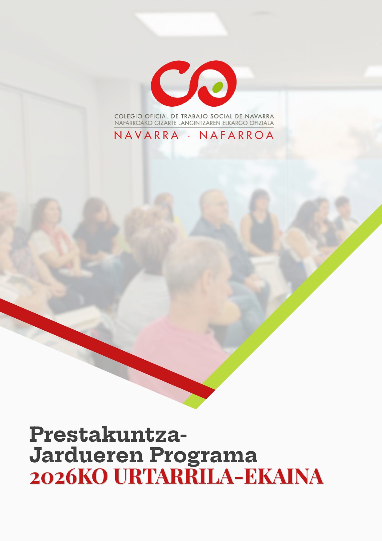 Nafarroako Gizarte Langintzaren Elkargoak 2026ko lehen seihilekorako prestakuntza-proposamen berri hau aurkeztuko du. Horren bitartez, denboran zehar formatu eta edukiaren aldetik bidali dizkiguzuen iradokizunak jasotzen ahalegindu gara; baita, plangintzaren aurretik urtero bidaltzen dizuegun galdetegiaren bidez jasotakoak ere. Gero eta pertsona gehiagok eskatzen digute etengabeko prestakuntza askotarikoa, malgua eta norberaren egoerara egokitzen dena izatea, eta, horri erantzuteko asmoarekin, NGLEOren hiru ardatz estrategiko kontuan hartzen dituen prestakuntza-plana diseinatu dugu: • Garapen profesionala • Zaintza eta norberaren zaintza gure lanbidean • Lidergoa Prestakuntza-eskaintza horrez gain, gogorarazi nahi dugu prestakuntza osa dezakezuela Gizarte Langintzako beste Elkargo Profesional batzuek eta Gizarte Langintzako Kontseilu Nagusiak antolatutako beste proposamen batzuen bitartez. Horiek gure sare sozialen eta/edo asteko buletinaren bidez zabaltzen ditugu.