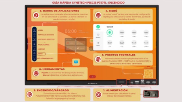 - General: permite seleccionar la fuente de entrada que se mostrará en el monitor y cambiar ajustes de brillo y volumen. Importante recordar que han de ir emparejados el HDMI con el USB Touch. Los dos cables han de ir conectados al mismo número si queremos tener el control táctil en la pantalla de lo que se está proyectando.
