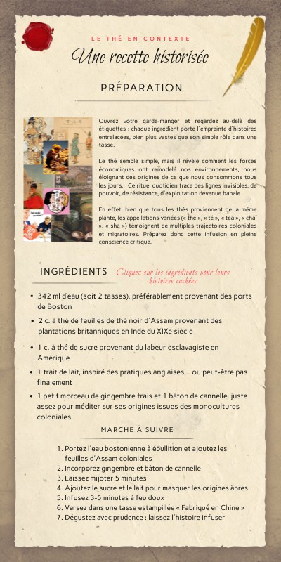 Ouvrez votre garde-manger et regardez au-delà des étiquettes : chaque ingrédient porte l'empreinte d'histoires entrelacées, bien plus vastes que son simple rôle dans une tasse. Le thé semble simple, mais il révèle comment les forces économiques ont remodelé nos environnements, nous éloignant des origines de ce que nous consommons tous les jours. Ce rituel quotidien trace des lignes invisibles, de pouvoir, de résistance, d'exploitation devenue banale. En effet, bien que tous les thés proviennent de la même plante, les appellations variées (« thé », « té », « tea », « chaï », « sha ») témoignent de multiples trajectoires coloniales et migratoires. Préparez donc cette infusion en pleine conscience critique.