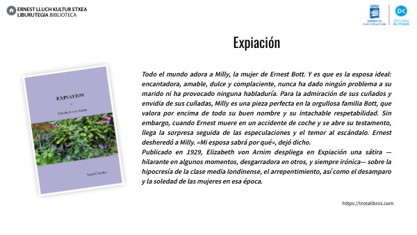 Todo el mundo adora a Milly, la mujer de Ernest Bott. Y es que es la esposa ideal: encantadora, amable, dulce y complaciente, nunca ha dado ningún problema a su marido ni ha provocado ninguna habladuría. Para la admiración de sus cuñados y envidia de sus cuñadas, Milly es una pieza perfecta en la orgullosa familia Bott, que valora por encima de todo su buen nombre y su intachable respetabilidad. Sin embargo, cuando Ernest muere en un accidente de coche y se abre su testamento, llega la sorpresa seguida de las especulaciones y el temor al escándalo. Ernest desheredó a Milly. «Mi esposa sabrá por qué», dejó dicho. Publicado en 1929, Elizabeth von Arnim despliega en Expiación una sátira —hilarante en algunos momentos, desgarradora en otros, y siempre irónica— sobre la hipocresía de la clase media londinense, el arrepentimiento, así como el desamparo y la soledad de las mujeres en esa época.
