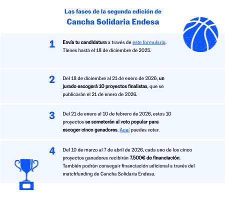 Del 10 de marzo al 7 de abril de 2026, cada uno de los cinco proyectos ganadores recibirán 7.500€ de financiación. También podrán conseguir financiación adicional a través del matchfunding de Cancha Solidaria Endesa.