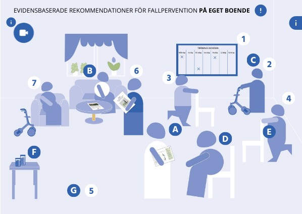 Alla rekommendatationer i materialet kommer ifrån de senaste evidensbaserade globala rekommendationerna för fallprevention. Det motsvarar både informationen i faktabladet för fallprevention och informationen i kunskapsstödet för fallprevention. I de flesta informationsrutorna finns även länkar till relevanta sidor i kunskapsstödet.