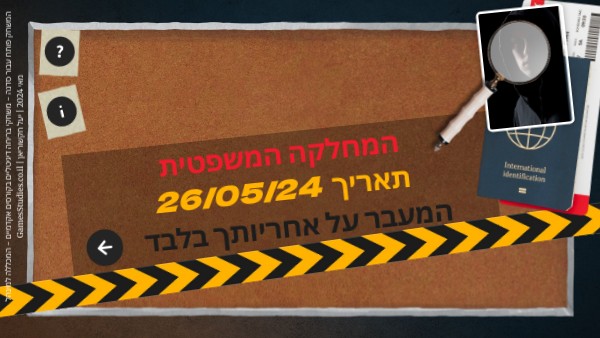 צוות חוקרים הגיע לעצור חשוד בפלילים ומצא את דירתו ריקה ומבולגנת. הסימנים מראים שהחשוד מתכוון להימלט מהארץ. עזרו לצוות למצוא רמזים שיסייעו לחשוף מה הוא מתכנן. לחצו על פריטים או הזיזו אותם כדי לאתר רמזים שיסייעו בחקירה. רשמו פרטי מידע שיסייעו בפתרון (עליכם לזהות חוקים, צווים ותיקונים בחוק). חושבים שהצלחתם לפענח את המקרה? הקלידו את מספר התיק לסגירתו. למשחק מיטבי רצוי להדליק רמקולים.