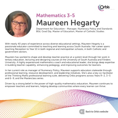 With nearly 40 years of experience across diverse educational settings, Maureen Hegarty is a passionate educator committed to teaching and learning across South Australia. Her career spans teaching Reception to Year 10 in both regional and metropolitan schools, in both Catholic and government sectors. Maureen has worked to shape and develop teacher practice at a system level through her work in tertiary education, lecturing and designing courses at the University of South Australia and Flinders University. A highly experienced mathematics coach and educational leader, she brings deep expertise in building teacher capability, enhancing pedagogy, and improving outcomes for learners. In her current role as manager of Numeracy Policy, Maureen supports educators statewide through professional learning, resource development, and leadership initiatives. She’s also a key co-facilitator of the Thinking Maths professional learning suite, delivering Orbis programs across Years R–2, 3–5 and 6–9, and the Masterclass series. Driven by a strong belief in the power of high-quality mathematics education, Maureen continues to empower teachers and learners, helping develop communities where every learner can thrive.