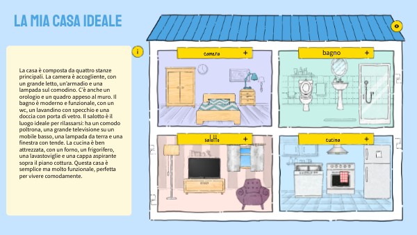 For teachers Have your students learn the different parts of the house in a fun and interactive way. Help them practice other languages by translating the names of the different rooms. You can also label each item with its name! For students Drag and drop each item to the correct room where they are to be found. Hint: There are 4 items in each room.