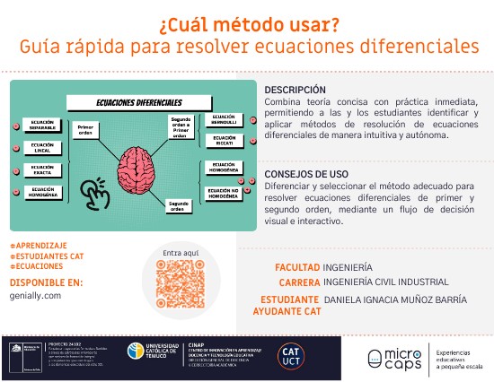 DESCRIPCIÓNCombina teoría concisa con práctica inmediata, permitiendo a las y los estudiantes identificar y aplicar métodos de resolución de ecuaciones diferenciales de manera intuitiva y autónoma.
