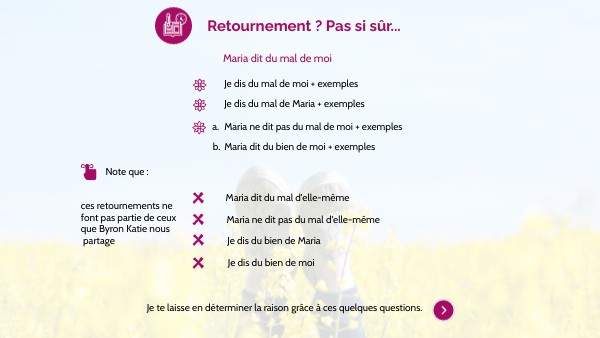 ¿Partí del pensamiento original? ¿Mantuve las mismas palabras? ¿Mi inversión entra en alguna de estas categorías? - hacia mí misma/o: cuando me pongo en el lugar de la persona a la que estaba juzgando - hacia el otro: cuando invierto los roles del pensamiento original - hacia el opuesto: cuando encuentro el polo opuesto del pensamiento original ¿Invertí solo una parte del pensamiento a la vez, o invertí dos o más? ¿Volví a invertir una inversión sin darme cuenta?