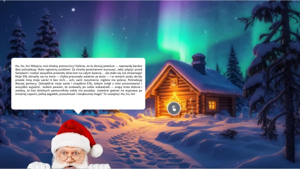 Ho, ho, ho! Witajcie, moi drodzy pomocnicy! Dobrze, że tu dzisiaj jesteście — naprawdę bardzo Was potrzebuję. Mam ogromny problem! Za chwilę powinienem wyruszyć, żeby zdążyć przed Świętami i rozdać wszystkie prezenty dzieciom na całym świecie… ale stało się coś strasznego! Moje Elfy obraziły się na mnie — chyba pracowały ostatnio za dużo — i w ramach psoty ukryły przede mną moje sanie! A bez nich… ech, sami rozumiecie, nigdzie nie polecę. Potrzebuję Waszej pomocy. Odnajdźcie moje sanie i znajdźcie Elfy, żebym mógł z nimi porozmawiać i wszystko wyjaśnić. Jestem pewien, że zostawiły po sobie wskazówki — znają mnie dobrze i wiedzą, że bez dzielnych pomocników sobie nie poradzę. Jesteście gotowi na wyprawę po śnieżnej Laponii, pełną zagadek, poszukiwań i świątecznej magii? To ruszajmy! Ho, ho, ho!