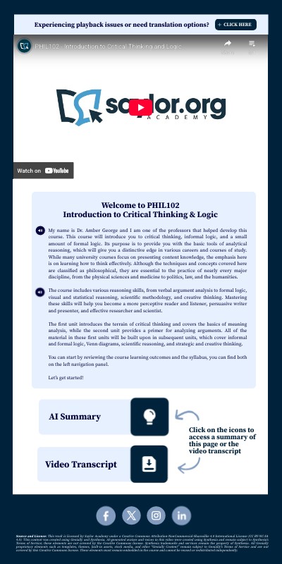 My name is Dr. Amber George and I am one of the professors that helped develop this course. This course will introduce you to critical thinking, informal logic, and a small amount of formal logic. Its purpose is to provide you with the basic tools of analytical reasoning, which will give you a distinctive edge in various careers and courses of study. While many university courses focus on presenting content knowledge, the emphasis here is on learning how to think effectively. Although the techniques and concepts covered here are classified as philosophical, they are essential to the practice of nearly every major discipline, from the physical sciences and medicine to politics, law, and the humanities.The course includes various reasoning skills, from verbal argument analysis to formal logic, visual and statistical reasoning, scientific methodology, and creative thinking. Mastering these skills will help you become a more perceptive reader and listener, persuasive writer and presenter, and effective researcher and scientist. The first unit introduces the terrain of critical thinking and covers the basics of meaning analysis, while the second unit provides a primer for analyzing arguments. All of the material in these first units will be built upon in subsequent units, which cover informal and formal logic, Venn diagrams, scientific reasoning, and strategic and creative thinking. You can start by reviewing the course learning outcomes and the syllabus, you can find both on the left navigation panel. Let’s get started!