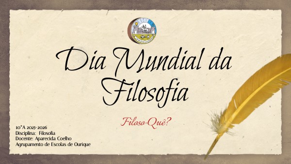 Dia Mundial da Filosofia Comemoração da 3.ª quinta feira de Novembro. Em 2002 a UNESCO decidiu criar o Dia Mundial da Filosofia, pois havia a necessidade de refletir sobre os acontecimentos atuais, fomentando o pensamento crítico, criativo e independente, de modo a contribuir para a promoção da tolerância e da paz. Dia 20 de novembro de 2025 de forma a assinalar o dia mundial da filosofia, foi realizado na escola básica e secundária de Ourique diversas atividades, tais como: exposições “Filosofar no feminino” “Mitos Gregos”, Jogos filosóficos, MúsicoTerapia, CháTerapia, um stand informativo CPCJ, Cantinho da Leitura , Workshop “Penso Logo Existo” (rene decartes) um filósofo muito conhecido. Todas as atividades serviram para comemorar tal dia e para todos os alunos participarem de forma mais ativa, tendo sido um dia muito enriquecedor.