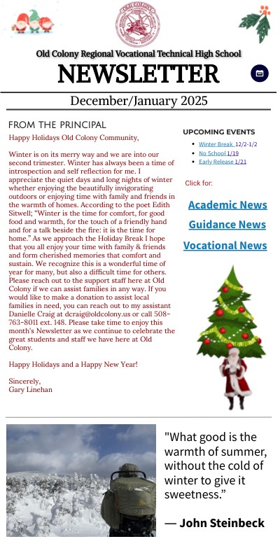 Happy Holidays Old Colony Community, Winter is on its merry way and we are into our second trimester. Winter has always been a time of introspection and self reflection for me. I appreciate the quiet days and long nights of winter whether enjoying the beautifully invigorating outdoors or enjoying time with family and friends in the warmth of homes. According to the poet Edith Sitwell; “Winter is the time for comfort, for good food and warmth, for the touch of a friendly hand and for a talk beside the fire: it is the time for home.” As we approach the Holiday Break I hope that you all enjoy your time with family & friends and form cherished memories that comfort and sustain. We recognize this is a wonderful time of year for many, but also a difficult time for others. Please reach out to the support staff here at Old Colony if we can assist families in any way. If you would like to make a donation to assist local families in need, you can reach out to my assistant Danielle Craig at dcraig@oldcolony.us or call 508-763-8011 ext. 148. Please take time to enjoy this month's Newsletter as we continue to celebrate the great students and staff we have here at Old Colony. Happy Holidays and a Happy New Year! Sincerely, Gary Linehan