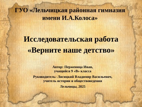 Автор: Перженица Иван, учащийся 9 «В» класса Руководитель: Лисицкий Владимир Васильевич, учитель истории и обществоведения Лельчицы, 2025