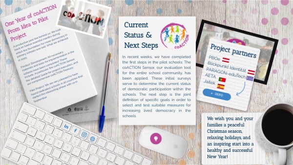 In the new year, our focus will be on the implementation of the defined measures and on supporting the schools in their practical work. We look forward to the joint activities.Para documentar cada uno de los pasos del proceso, el Diario coACTION no solo permite seguir el progreso del proyecto, sino también recoger experiencias y logros propios. The entire coACTION team sincerely thanks you for your interest and support in the last months.