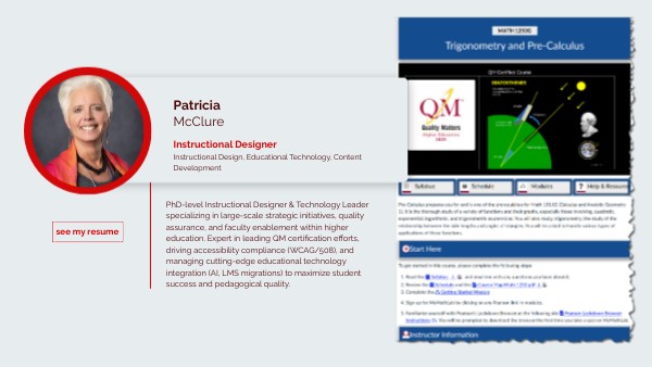 PhD-level Instructional Designer & Technology Leader specializing in large-scale strategic initiatives, quality assurance, and faculty enablement within higher education. Expert in leading QM certification efforts, driving accessibility compliance (WCAG/508), and managing cutting-edge educational technology integration (AI, LMS migrations) to maximize student success and pedagogical quality.